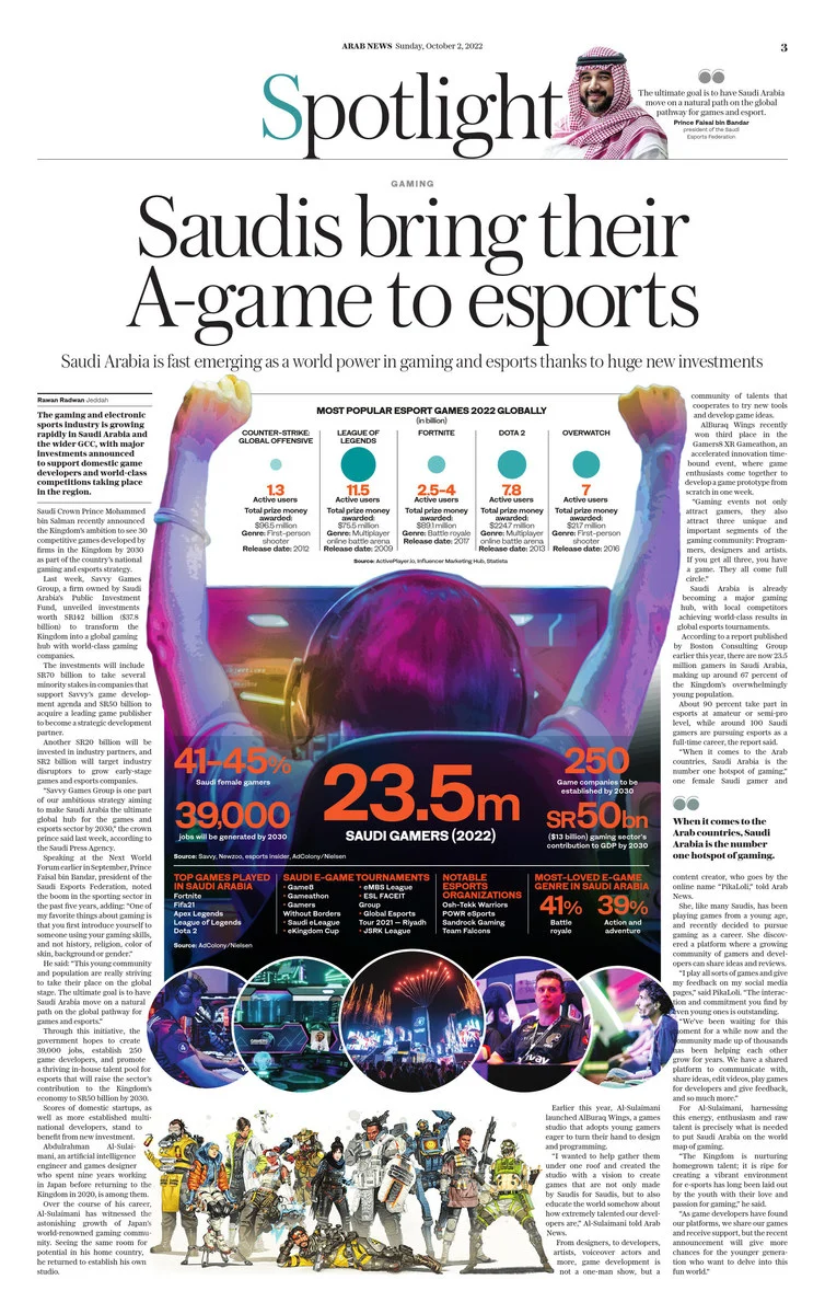 Sebagai sebahagian daripada rancangan permainan dan e-sukan negara, Putera Mahkota Saudi Mohammed bin Salman baru-baru ini menyatakan matlamat Kerajaan untuk mempunyai 30 permainan kompetitif yang dihasilkan oleh syarikat Saudi menjelang 2030.