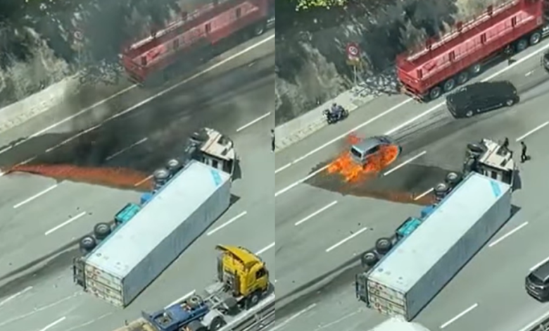 Dalam video tersebut, kelihatan banyak kenderaan ingin lalu di kawasan tersebut, dan ada kereta yang hampir terbakar apabila melalui sebelah kawasan treler tersebut jatuh.